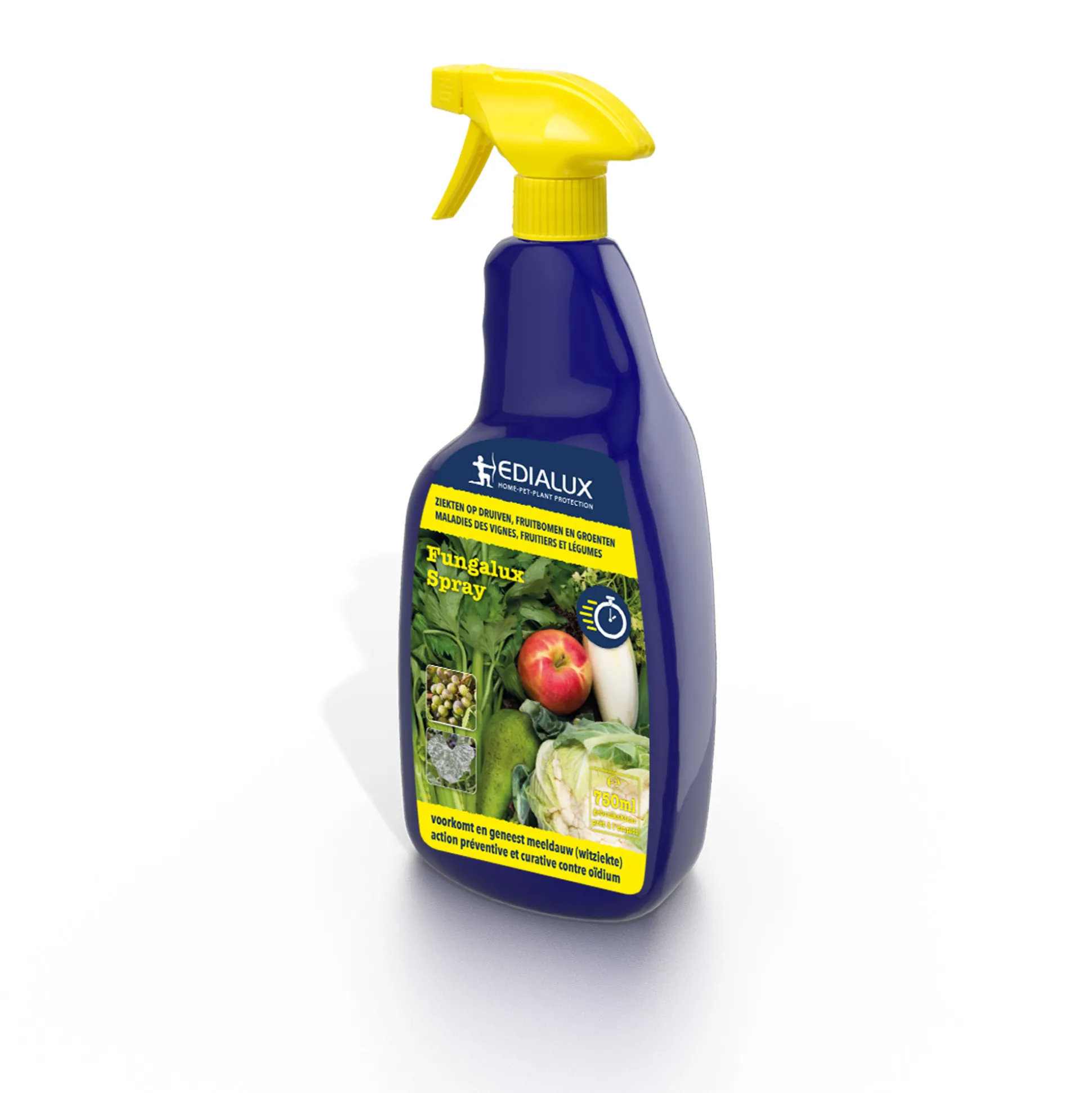 Snelwerkend fungicide voor de bestrijding van echte meeldauw (witziekte), zwartvruchtrot en vruchtrot op groenten, fruit en sierplanten evenals appelschurft. Zowel preventief (na regen en bij hoge luchtvochtigheid) als curatief na infectie te gebruiken. Een gepatenteerd bevochtigingssysteem zorgt er voor dat de spray de plant volledig bedekt en het wegspoelen van de werkzame stof door regen wordt beperkt. Slechts 1 dag wachttijd tussen behandeling en oogst.